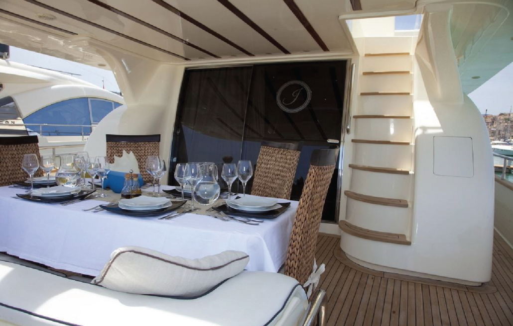 Il ponte offre ampie aree tipiche di yacht significativamente più grandi: una zona prendisole a prua dotata di cuscini; il topdeck presenta un ulteriore prendisole e un ulteriore tavolo da pranzo con posti a sedere; l’enorme pozzetto offre anche un tavolo da pranzo per mangiare all’aperto e dà accesso alla piattaforma da bagno per un facile accesso al mare.