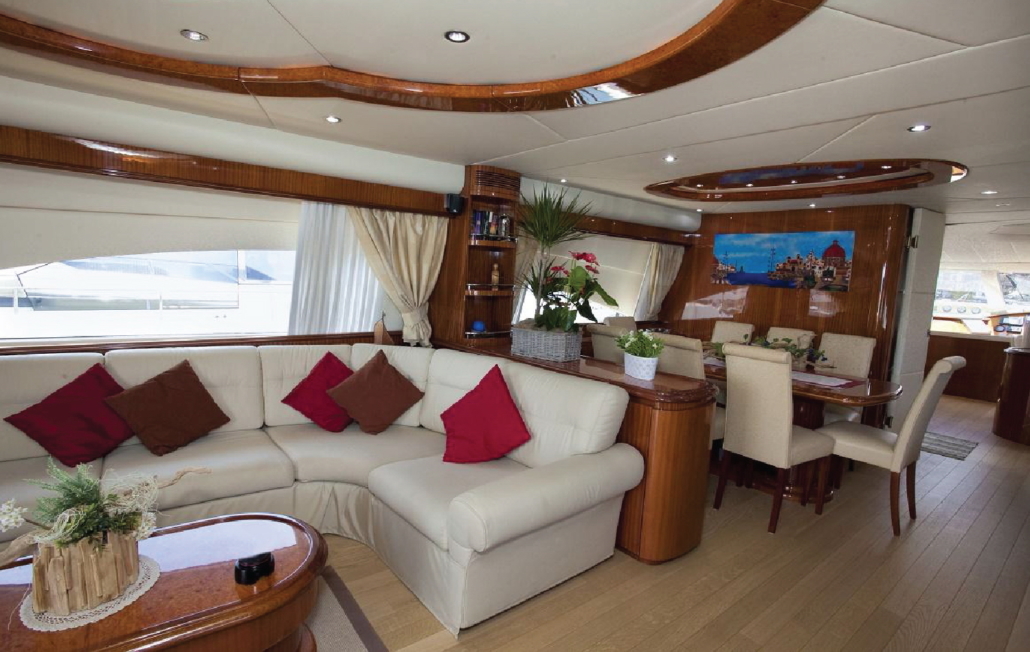 Gli interni di Jauni offrono un ampio salone con divano a forma di U, TV a schermo piatto, ampie finestre che danno luminosità all’area e un comodo tavolo da pranzo per 8/10 ospiti. La cucina completamente equipaggiata è a prua del salone, come il bagno del giorno principale, la timoneria e il tavolo da pranzo per l’equipaggio.