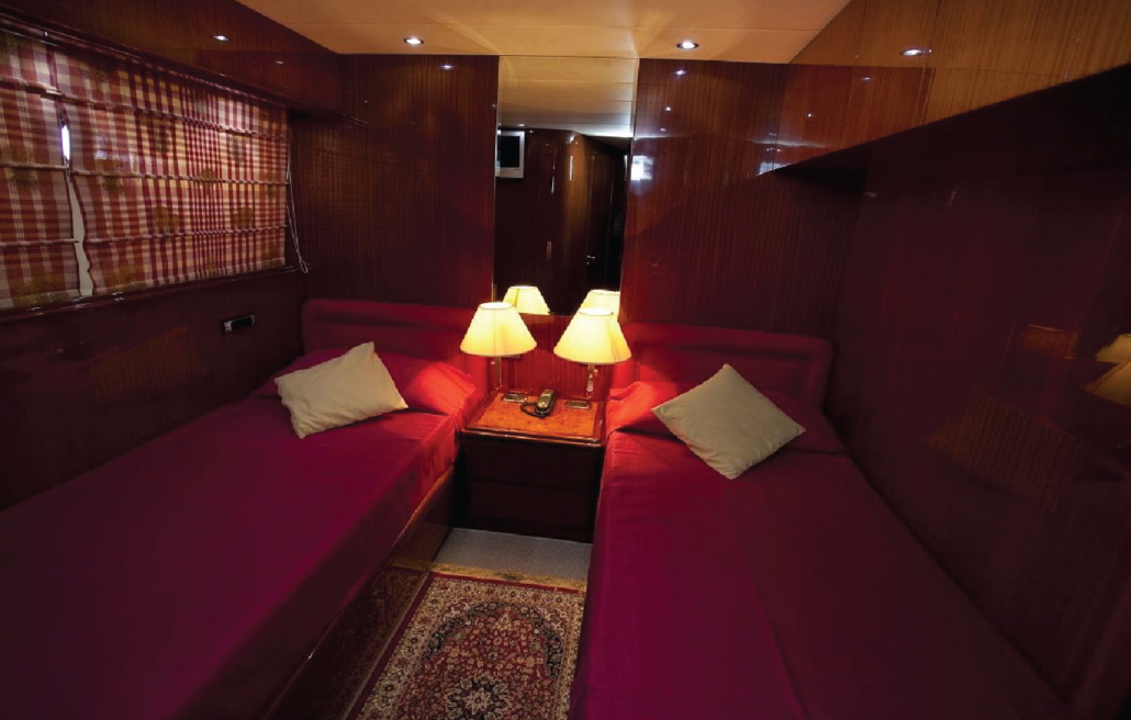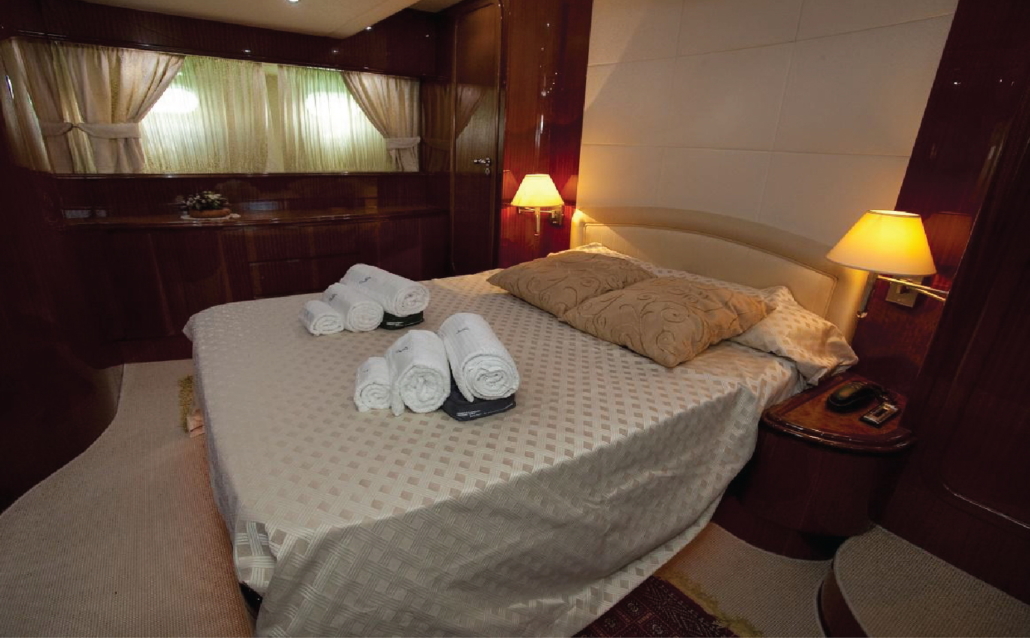 Cabina armatoriale a poppa con letto queen size, comodini, comò, luci di lettura, radio stereo, TV 22 ‘LCD, decoder, lettore DVD e decoder digitale terrestre. Ensuite testa fornita con lavabo, gabinetto, WC, bidet, doccia separata; Cassaforte, frigorifero, spogliatoio doppio, TV a schermo piatto e HI-FI audio