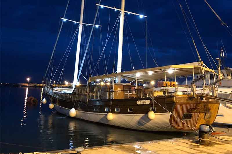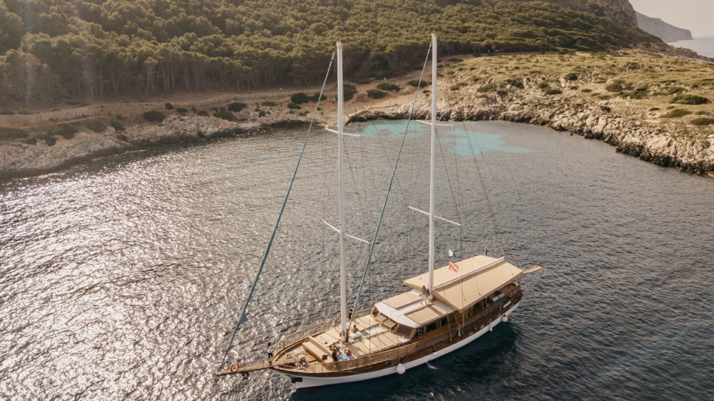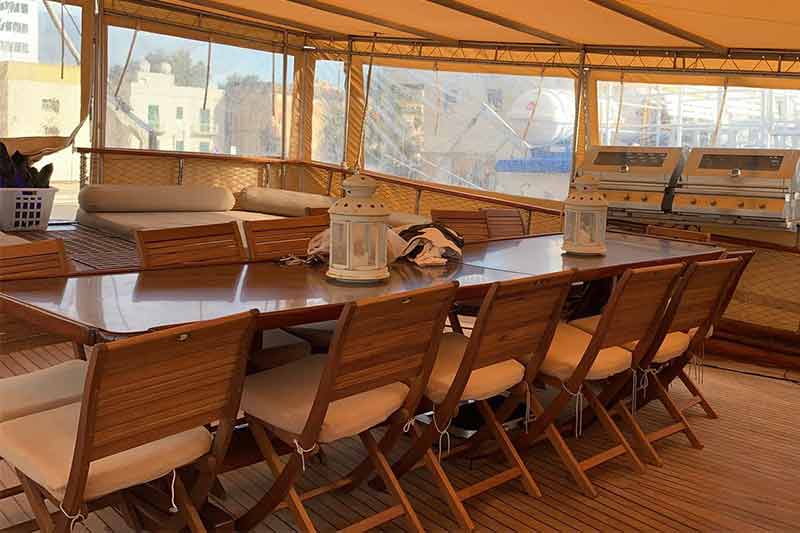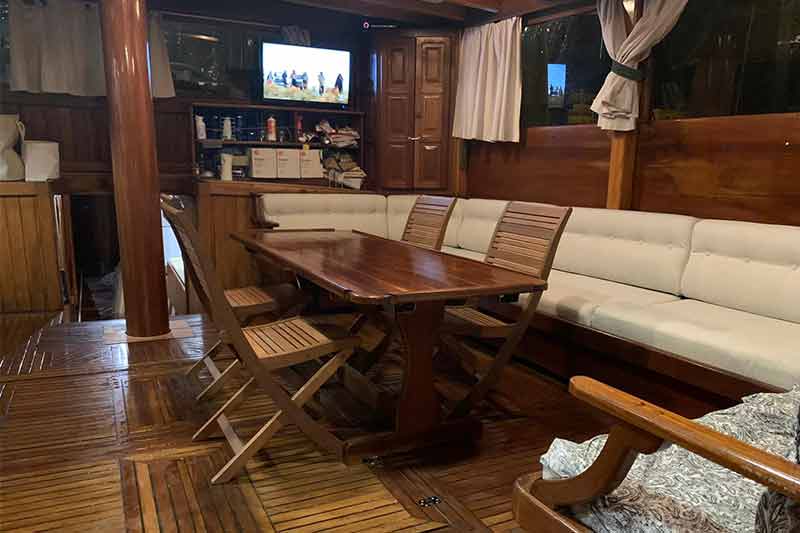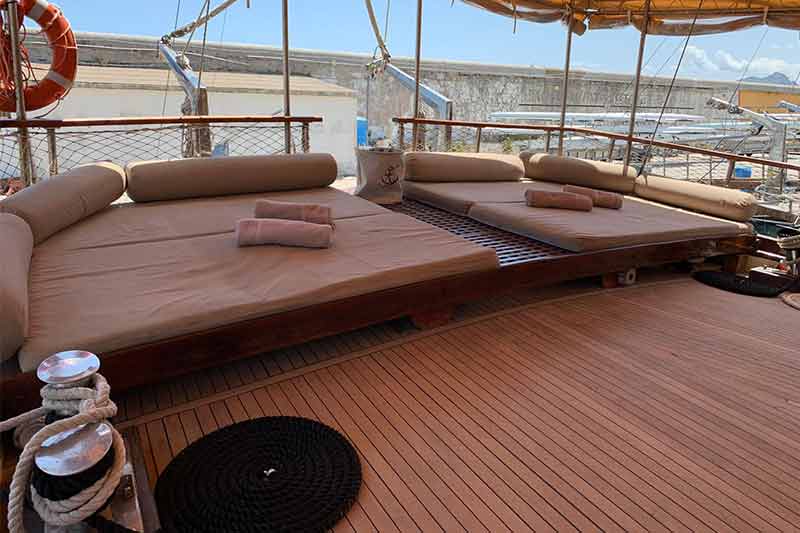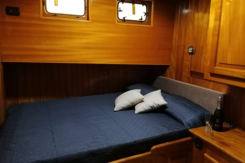 Hande offre un sorprendente comfort grazie agli ampi spazi di cui dispone. Il calore del mogano, usato per l’ampio salone e le cabine e il ponte in teak. Antiche lampade in ottone e grandi oblò provenienti da vecchie navi vi faranno respirare ed avvertire il fascino discreto di quelle che sono state le signore dei mari. 6 cabine ospiti accoglienti tutte con ingressi separati e con servizi privati. Impianto di aria condizionata in ogni cabina, spaziosi armadi ed utili cassetti. 2 le cabine per l’equipaggio con servizi indipendenti. All’interno l’ampio salone dispone di un’area bar, una zona lettura/musica ed un’ attrezzata area cucina per preparare gustosi piatti della tradizione mediterranea. Il ponte, spazioso, offre comodi lettini prendisole e angoli di piacevole relax.
