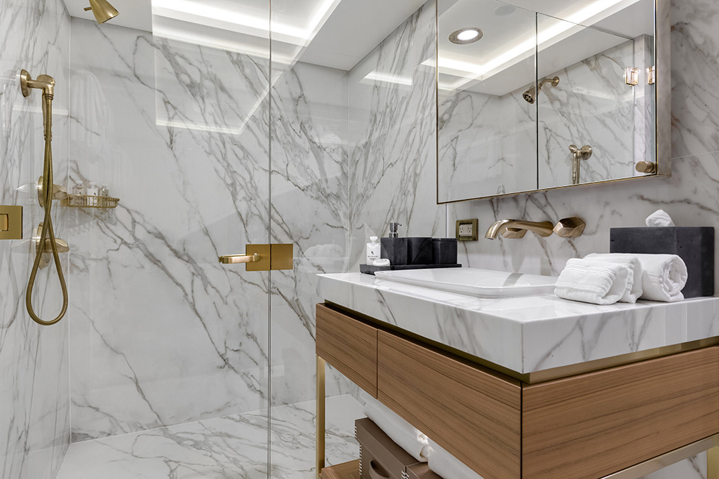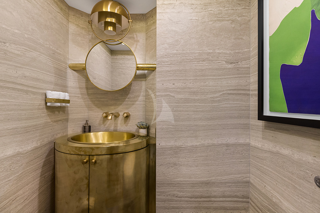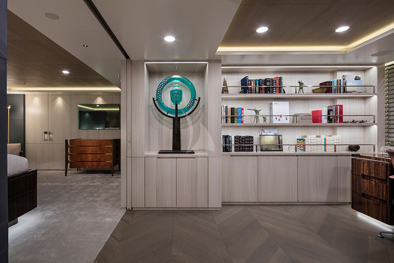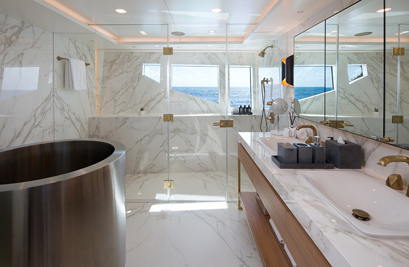 BROADWATER dall’ingresso formale, sul lato di dritta, si atterra nell’atrio formale. All’interno del foyer, si troverà una splendida scala a chiocciola che conduce al ponte del ponte o giù per le sistemazioni degli ospiti inferiori. L’intera facciata delle scale a chiocciola ha una finitura metallica impressionante fabbricata da Neal Feay e ispirata alla pratica giapponese, omikuji (strisce di cartomanzia giapponesi che si possono trovare nei santuari e nei templi), creando più strati di riflessione, trasparenza e sfumatura colorazione. Dall’area del foyer si può andare a poppa al salone da pranzo formale e al salone principale o in avanti al maestro sul ponte e alle cabine VIP.