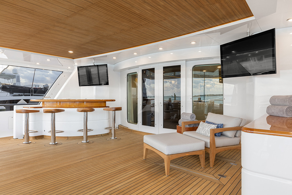 Su per le scale fino al ponte sole si raggiunge un’ampia area con divano incorporato, mobili sfusi e tavolo a poppa. Port è un divano circolare con tavolo. Più avanti verso la porta è una barra bagnata completa con quattro sgabelli da bar e nel mezzo del ponte sole in avanti è una grande vasca idromassaggio con ampia zona prendisole. Uno può scendere le scale un ponte sul ponte.