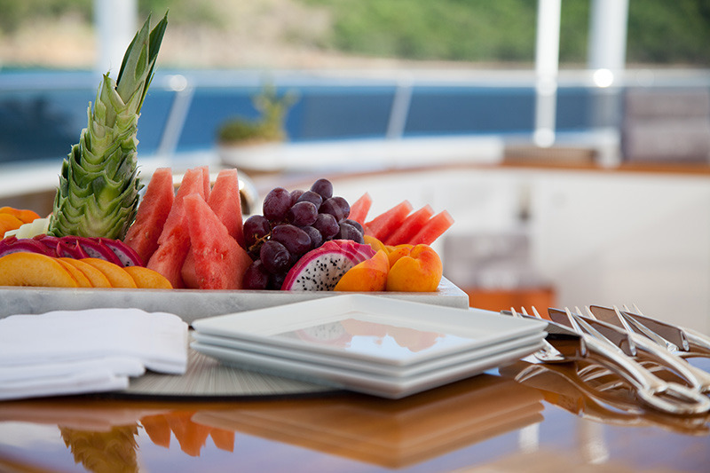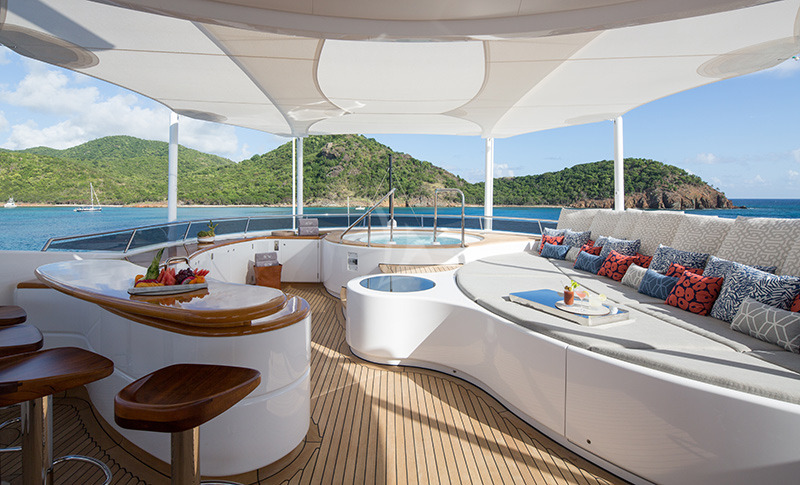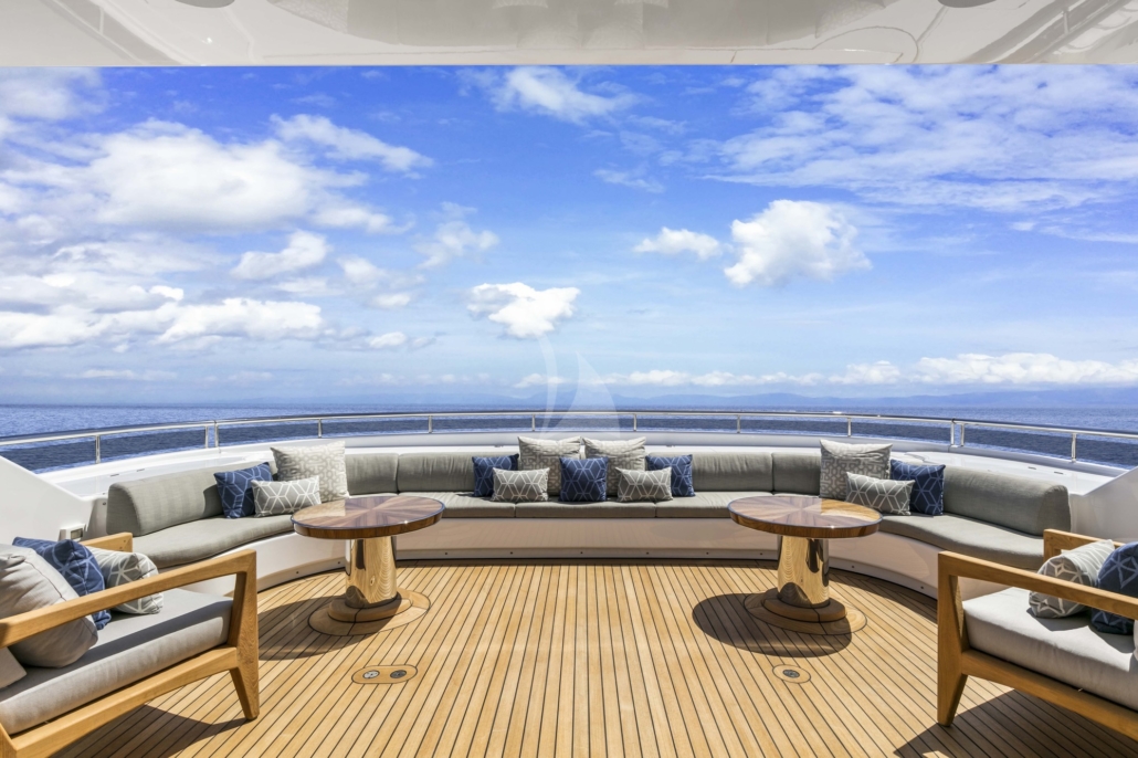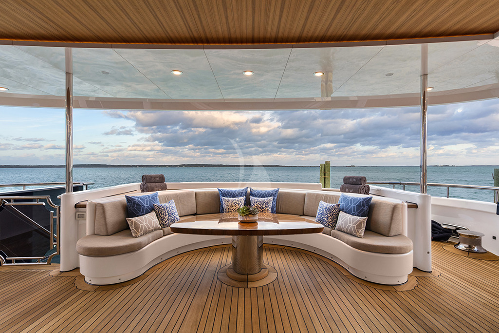 Andando a poppa si troverà l’impostazione matura ma giocosa dello skylounge, che abbraccia un layout circolare. C’è un divano semicircolare, disegnato da Vladimir Kagan, un tavolino e sedie Finn Juhl e un tavolo indipendente con quattro sedie Hans Wegner, perfetto per caffè, tè, giochi da tavolo o un incontro privato. A poppa attraverso le porte del ponte di skylounge è una spaziosa area con un grande tavolo da pranzo esterno, costruito in divani su entrambi i lati con ulteriori sedie sfuse e due ampie aree di servizio laterali. Si può andare sulla terrazza da una scala esterna che si trova sul ponte laterale di tribordo.