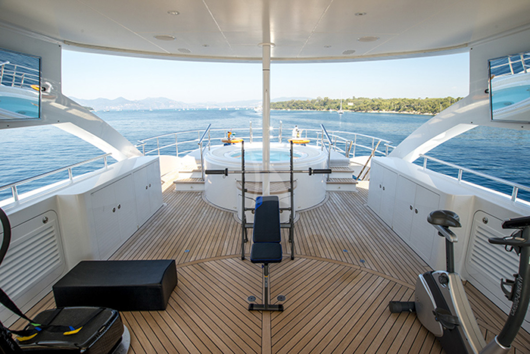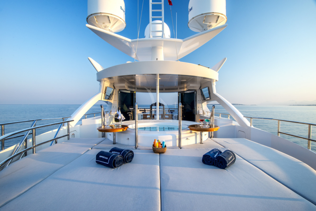 La vita esterna è generosa sullo yacht e il ponte di poppa è ideale per intrattenersi con cocktail e tartine, offrendo un’ampia area salotto, tavoli e accesso diretto al wet bar al coperto. Il ponte superiore offre un’opzione da pranzo all’aperto, in un’atmosfera intima e sociale a poppa, mentre in avanti, un ulteriore punto di ristoro all’aperto e un grande prendisole sono accessibili dai ponti laterali inferiori. Il prendisole a bordo del design a tre ponti SIROCCO presenta un generoso prendisole semicircolare, avvolto attorno alla lussuosa vasca Spa Pool. Una palestra ombreggiata offre agli ospiti di lavorare con viste idilliache. Avanti sulla terrazza, posti a sedere e tavoli da cocktail sono l’ideale per ogni momento del giorno o della notte.