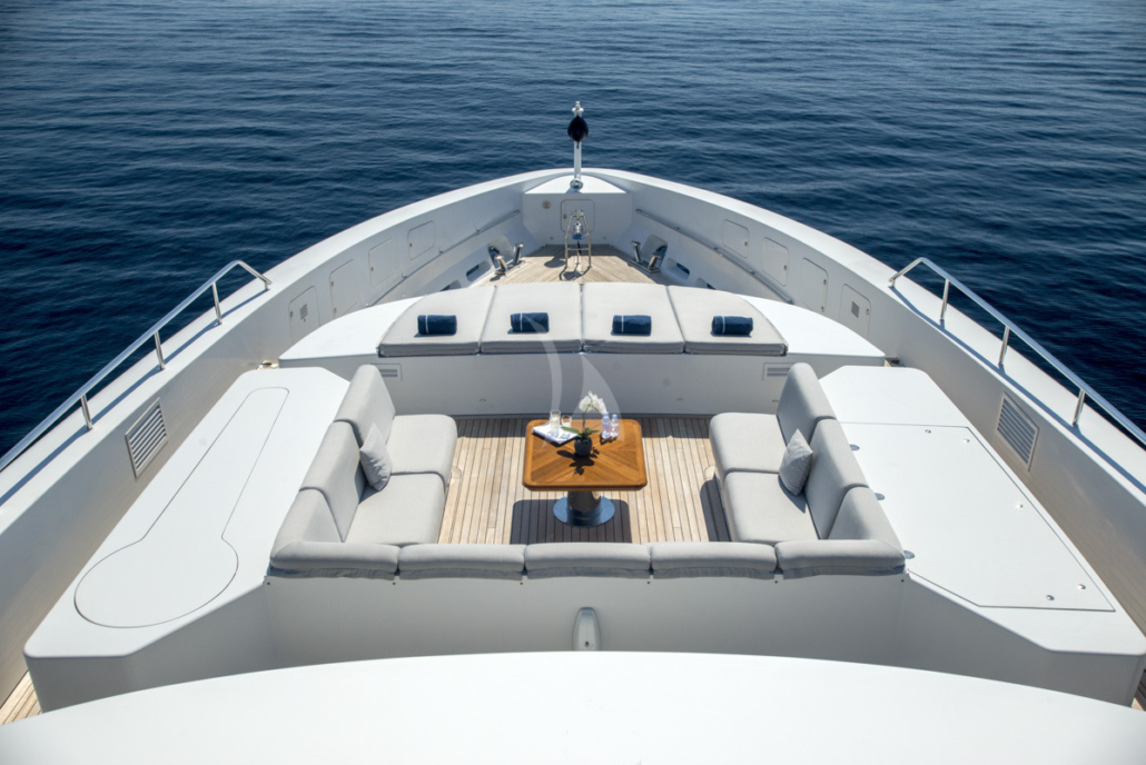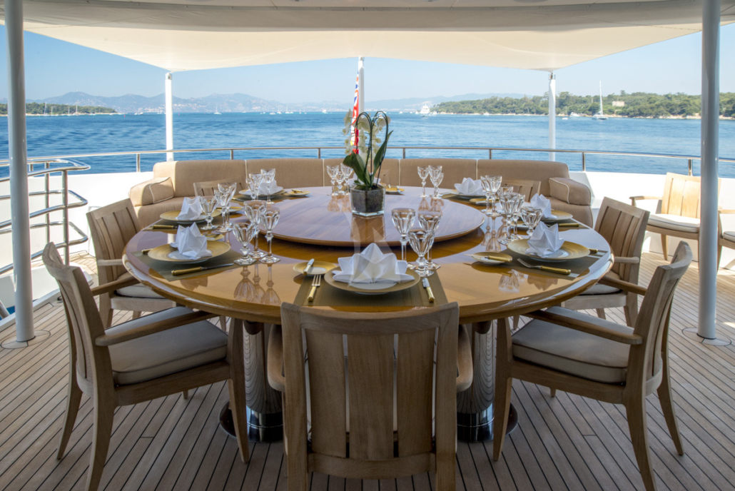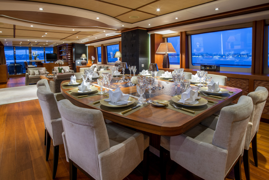 Il ponte principale a bordo del ha una barra bagnata marmoreo sopra entrando le porte scorrevoli poppiere, più lontano lo spazio di salone generoso di ampio raggio offre quattro ampi divani e un grande tavolino da caffè di vetro sormontato. A centro barca e davanti al salone, lo spazio da pranzo formale accoglie tutti e 12 gli ospiti in comfort e stile supremo. Gli ospiti che desiderano intrattenersi al coperto apprezzeranno l’home cinema full beam con ampi posti a sedere e un’enorme TV a schermo piatto.