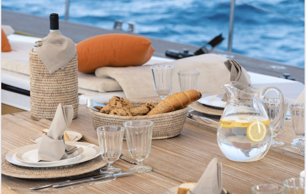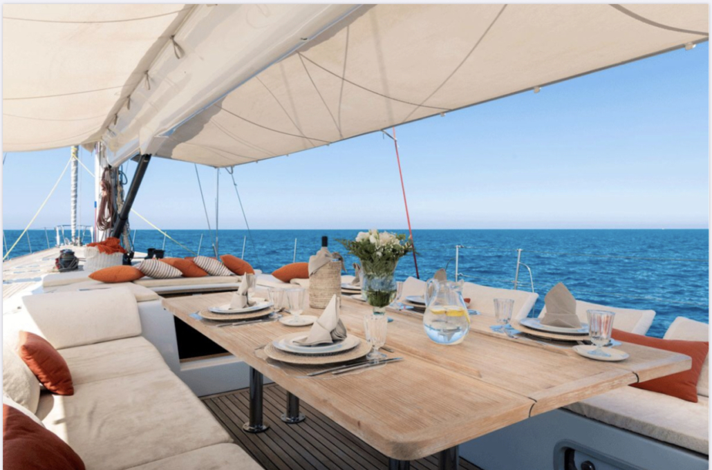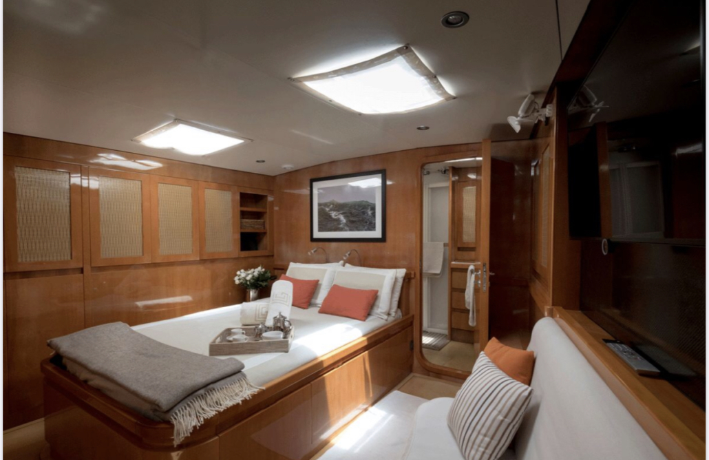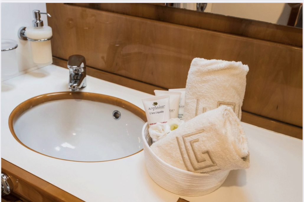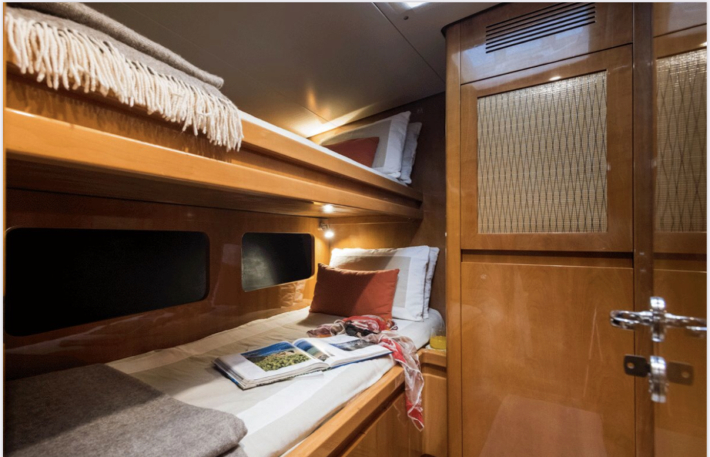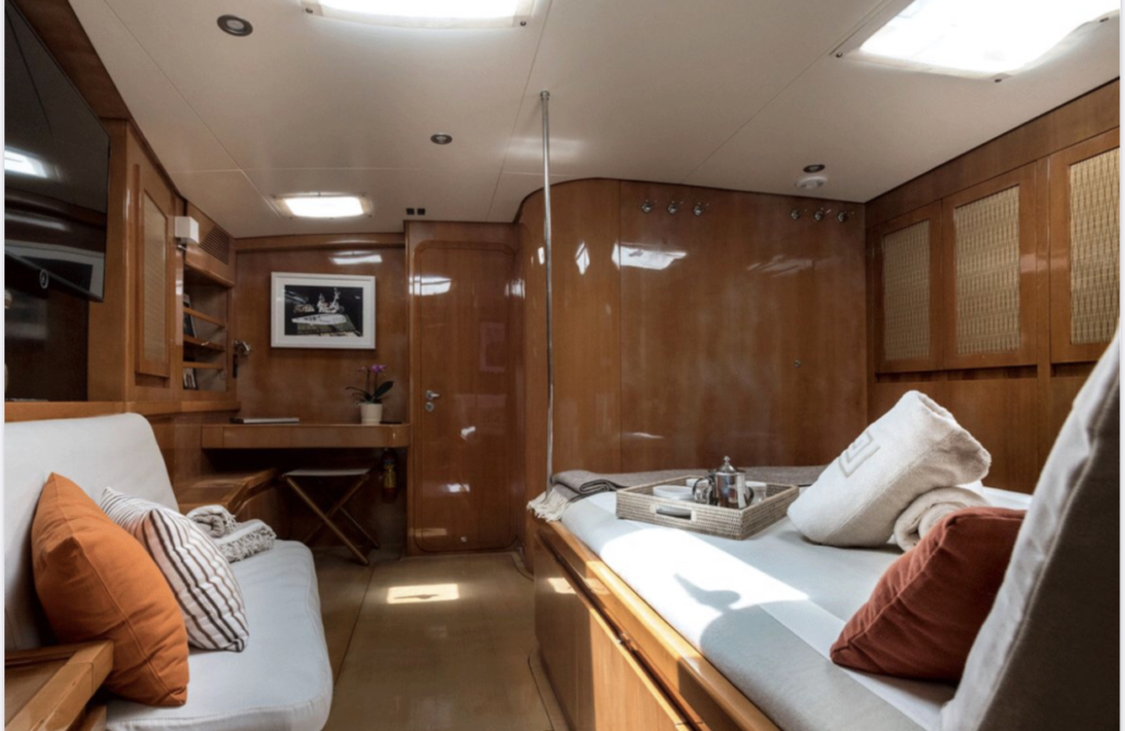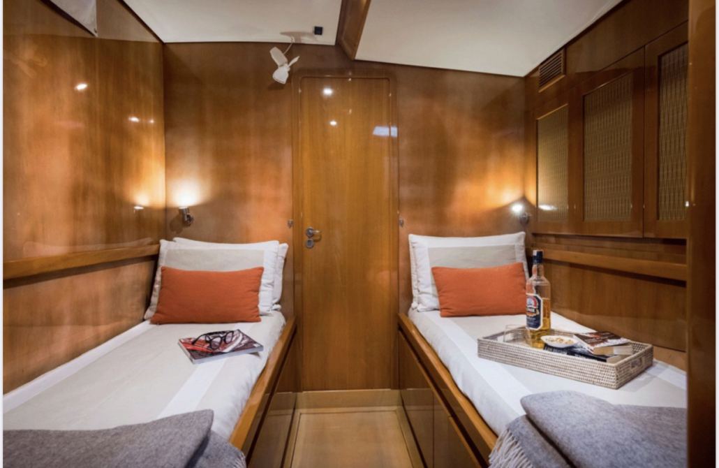 LOGICA ospita 8 persone in 4 cabine. A prua una armatoriale con letto matrimoniale, divanetto e servizio proprio. A centro barca vi sono due cabine ospiti doppie e una  con letti sovrapposti.